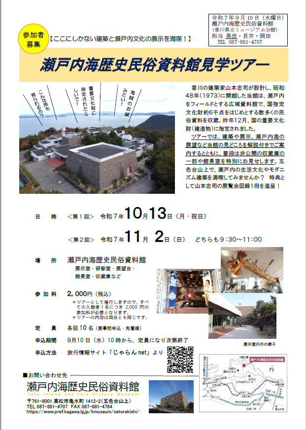 ツアーでは、建築や展示、瀬戸内海の展望など当館の見どころを解説付きでご案内するとともに、普段は非公開の収蔵庫の一部や館長室を特別にお見せします。桜の見ごろを迎える五色台山上で、瀬戸内の生活文化やモダニズム建築を満喫してみませんか?
